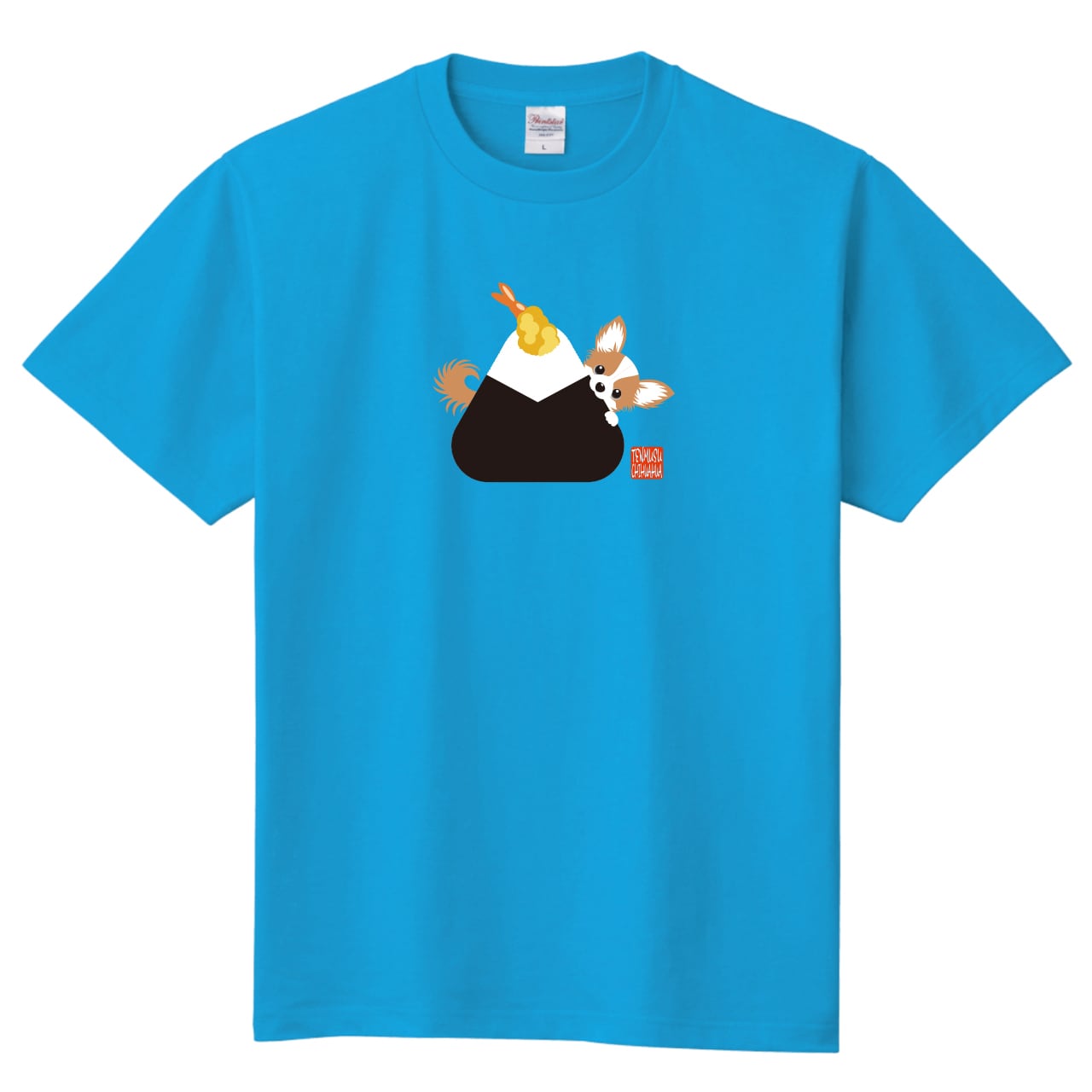 おにぎりにかぶりついたレッドタンチワワがかわいいTシャツ! ※完全受注制作のため、発注から納品まで約2週間ほどかかります。